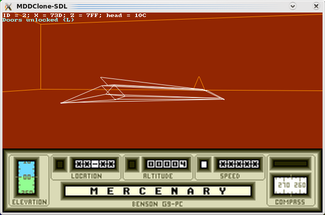 MDDClone-SDL is an SDL port of Mercenary, based on original games that were written by Paul Woakes and (C) 1986 Novagen. Currently, only Mercenary I: Escape From Targ and Second City (Mercenary I mission disk) are supported, but there are plans to extend the port to support Damocles and Dion Crisis.