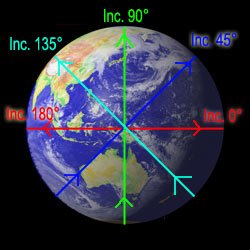 Przyjżyjmy się tym pojęciom bliżej. Zarówno Inklinacja jak i LAN są miarami orientacji płaszczyzny orbity. Są używane do określenia jak wygląda orbita w stosunku do Ziemi. Inklinacja to wartość nachylania płaszczyzny orbity. Wartość ta mieści się w przedziale od 0 do 180 stopni. Orbita o inklinacji 0 stopni to orbita, która znajduje sie dokładnie nad równikiem i przesuwa sie w tym samym kierunku, co ruch rotacyjny Ziemi (z zachodu na wschód czyli "Prograde"). Orbita o inklinacji 180 stopni to orbita, która rownież znajduje się dokładnie nad równikiem, lecz przesuwa się ze wschodu na zachód (w tym przypadku - "Retrograde" {wsteczna} ). Orbita o inklinacji 90 stopni przechodzi ponad biegunami. (przyp. tłum. - w aktualnej wersji Orbitera standartowym widokiem na Orbit MFD jest ekliptyczny, przez co inklinacje tu podane nie będą ci się zgadzać. Możesz to przełączyć używając w Orbit MFD przycisku FRM (Frame) lub naciskając Shift + F)