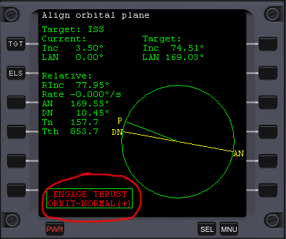 W momencie gdy RInc będzie bliskie 0°, wskaźniki AN i DN szybko odsuną się od ciebie i wyświetli się napis KILL THRUST. Mając autopilota ciągle uruchomionego (+ lub - normalny do orbity), możesz teraz zignorować napisy MFD Wyrównywania Płaszczyzn i przyciskać przez chwile klawisze głównych (NumPad +) i wstecznych silników (NumPad - ale najpierw musisz otworzyć Ctrl + Spacja i Retro Doors na Open), żeby ustawić RInc możliwe jak najbliżej 0°. Możesz użyć długościowych silniczków przesunięcia liniowego (NumPad 9 i 6) dla dokladniejszej kontroli (przyp. tłum. - przytrzymując ctrl silniczki działają 10x słabiej co daje możliwość jeszcze dokładniejszego wyrównania). W ten sposób powinno ci się udać doprowadzić RInc do wartości mniejszej niż 0.1°. Możesz znowu zmniejszyć RInc przy następnym przejściu przez AN lub DN na wartość mniejszą niż 0.05°. W miarę skorygujesz RInc na dokładnie 0°, zauważysz, że AN i DN orbity twojego statku poruszą się tak, że twój statek będzie zlokalizowany w połowie drogi między nimi.