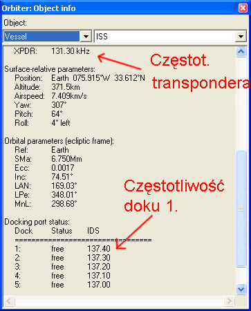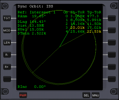 A teraz otwórz Orbit MFD (Shift + O). Upewnij się, że ISS jest obrane jako cel (Shift + T). Teraz możesz nacisnąć przycisk MOD żeby przełączać wyświetlanie wszystkich danych liczbowych.