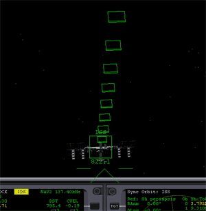 Zmień częstotliwość HUD'a na częstotliwość Doku 1. (NAV 2) używając Control + R. Jeśli ISS jest w twoim polu widzenia, to na HUD'zie zobaczysz znaczniki podchodzenia do dokowania (przyp. tłum. - jeśli nie widziesz to naciśnij Shift odpowiadający MFD Dokowania + V co przłącza między wyświetlaniem ich a nie wyświetlaniem). Znaczniki te odchodzą prosto na zewnątrz portu dokowania, który zaznaczyłeś. Dostarczają ci one wizualną świeżkę podchodzenia, żebyś mógł się w przybliżeniu ustawić w kierunku portu dokowania.