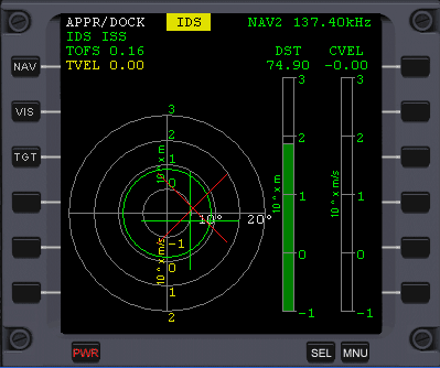 Nastaw MFD Dokowania na NAV 2 klikając na przycisk NAV po lewej stronie MFD. MFD Dokowania wyświetla teraz dodatkowe informacje o twojej pozycji i orientacji w odniesieniu do portu dokowania.
