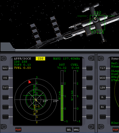 Zorienrujmy teraz rotacyjnie nasz port dokowania z portem ISS. MFD Dokowania wyświetla trójkąt wyrównania rotacyjnego, który jest skierowany na zewnątrz razem z najdłuższym pierścieniem tarczy. Ten trójkąt wskazuje "górę" docelowego doku. Pozatym, jeśli nastawisz HUD na częstotliwość portu, to prostokąty ścieżki podejścia posiadają podwójną linię po tej stronie, która wskazuje górę portu dokowania.