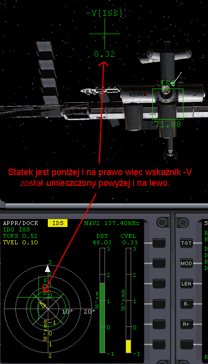 Przyspiesz liniowo - Numpad 8 (góra), 2 (dół), 1 (lewo), and 3 (prawo) - żeby wycentrować + na tarczy MFD Dokowannia. Tak jak poprzednio, wskaźnik -V pokaże się blisko ISS. Pokazuje on kierunek, w którym zmierzasz, względem ISS. Wykorzystaj go do pomocy przy ustawianiu się na środku ścieżki podchodzenia. Jeśli przyspieszysz liniowo żeby umieścić -V w tej samej pozycji, względem portu dokowania, w jakiej jest umieszczony + na panelu dokowania (powyżej i na lewo), to przemieścisz się w tym kierunku a + na panelu dokowania oddryfuje w kierunku środka.