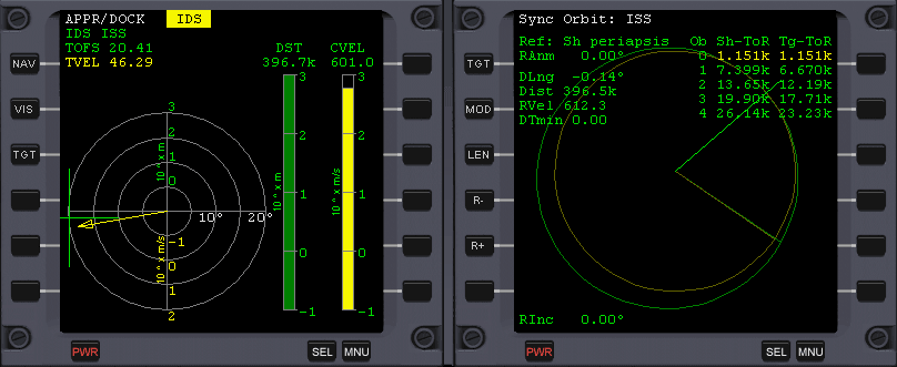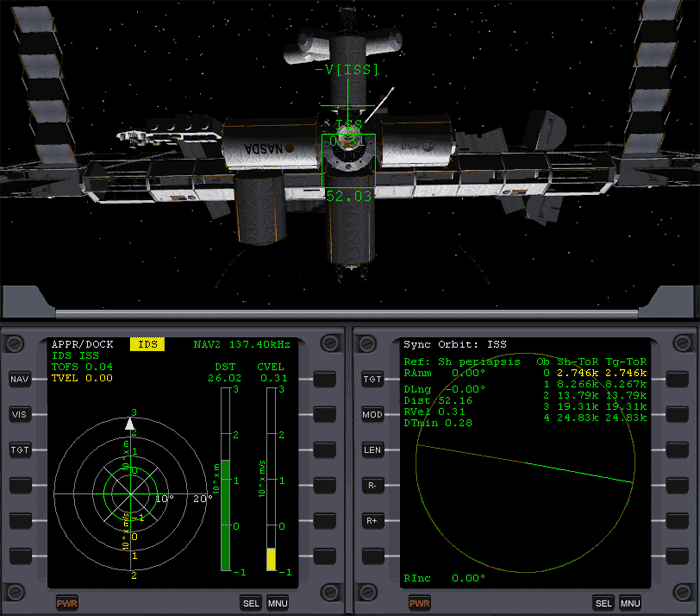 To ,,drabinkowe" podejście do ISS nie jest najdokładniejszym lub najwydajniejszym w kwestiach paliwa sposobem, lecz działa bardzo dobrze z dostępnymi nam narzędziami. Zaprogramowano dodatkowy MFD o nazwie Approach MFD, który zrobi to podejście w jednym odpaleniu silników, ale podejście to będzie bardzo powolne. Procedura, którą stosujemy działa bardzo dobrze i jest często dużo szybsza, choć niekoniecznie najbardziej realistyczna. Problem leży w tym, że kiedy przyspieszasz w stronę ISS, twój statek początkowo zmierza prosto na nią, lecz z powodu niewielkich różnic w waszych orbitach, twój kierunek lotu będzie wynikał z różnic w waszych prędkościach (co zależy od waszych wysokości), co ostatecznie spowoduje odchylenie twojego kursu od zamierzonego celu. Jeśli nie jesteś w statku o ogromnym ciągu, to w przestrzeni kosmicznej nigdy nie dolecisz do jakiegoś celu poprzez zwykłe ustawienie się na niego i odpalenie silników. W miarę jak zbliżasz się do ISS, przyspieszanie dokłandnie w jej stronę działa dużo skuteczniej ponieważ wasze wysokości są dużo bardziej podobne.