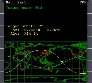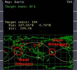 A więc, żeby dostać się z Mir'a do ISS, musimy nie tylko skorygować naszą aktualną orbitę tak, żeby inklinacje były takie same, lecz musimy również OBRÓCIĆ tą płaszczyznę wokół środka Ziemi tak, żeby przecinała równik w tym samym miejscu i żeby była zorientowana w tym samym kierunku co orbita docelowa (czyli LAN'y muszą być takie same). W rzeczywistości inklinacja Mir'a była taka sama jak inklinacja ISS ale LAN'y bardzo różniły się między sobą. W Orbiterze zarówno inklinacje jak i LAN'y są różne. Możesz to zaobserwować po włączeniu Map MFD (Shift + M) i wybraniu jako cel ISS (kliknij na przycisk "TGT" i wpisz "ISS").