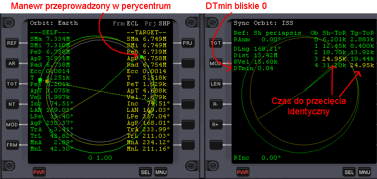 Pomimo tego, że płaszczyzny naszych orbit są wyrównane, możemy być wyżej (lecieć wolniej) niż ISS, niżej (leciec szybciej) niż ISS, lub jeśli nasza orbita ma dużą ekscentryczność (owalny kształt) to może jedno i drugie. Chcemy znaleźć chwilę, w której nasze położenie, wysokość i prędkość będą bardzo zbliżone do tych samych parametrów ISS, żebyśmy mogli zadokować.