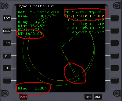 Otwórz MFD Wyrównywania Płaszczyzn na lewym wyświetlaczu (Lewy Shift + A). Jako cel obierz ISS (Lewy Shift + T i wpisz "ISS"). Wyświetlacz pokazuje naszą aktualną inklinację (Inc) i LAN oraz Inc i LAN stacji ISS (wyświetlone pod "Target:"). MFD Wyrównywania Płaszczyzn pokazuje również różnicę lub relatywną inklinację pomiedzy płaszczyzną naszej orbity a płaszczyzną orbity ISS (RInc). Tą liczbą jesteśmy zainteresowani najbardziej. Chcemy aby RInc wynosiła 0 stopni. Inne liczby pomogą nam ustalić czas rozpoczęcia naszych manewrów wyrównujących.