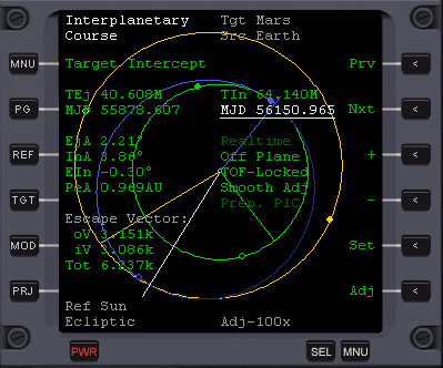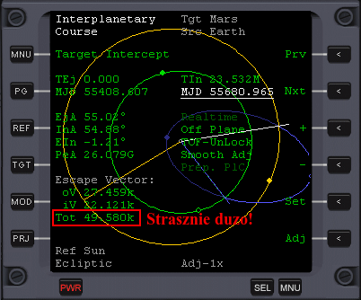 Otwórz IMFD w obu wyświetlaczach i skojarz lewy z prawym, klikąjac na Menu - Share i wpisując ID prawego (prawdopodobnie 1). W lewym w glownym menu wybierz Configuration i przelącz Mission Timer z GET na MJD. Pozwoli to na szybsze wyszukanie okienka startu. Ponownie w lewym MFD wybierz Course - Target Intercept, kliknij TGT i wpisz Mars. Jesli IMFD wyświetli komunikat o błędzie, to dokonaj nast. zmian: