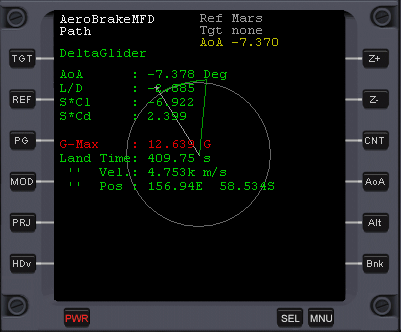 Włącz Aerobrake MFD w lewym wyświetlaczu, a w prawym Orbit MFD. W zewnętrznym (Ctrl + F4 i External MFD) możesz włączyc Surface MFD, aby obserwować aktualne opoźnienie ACC. Gdy będziesz już blisko Marsa, czyli jakieś 3 Mm Alt na Surface Hud, zobacz w AeroBrake, jaki musisz mieć najmniejszy kąt AoA, aby nie odbić sie od atmosfery. Dla zwykłego DG bedzie to kąt ujemny. Będzie to wyglądało mniej więcej tak: