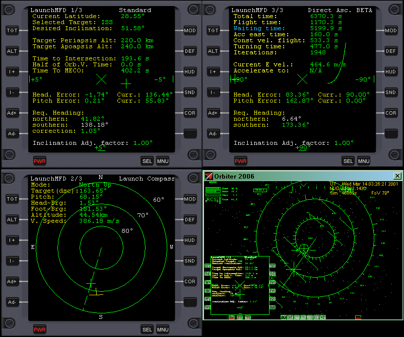 Launch MFDContinuously developed Orbiter's Multifunctional Display which calculates a necessary azimuth with which you must launch and fly your spacecraft, to reach an orbit with certain parameters. Additional features of Launch MFD: