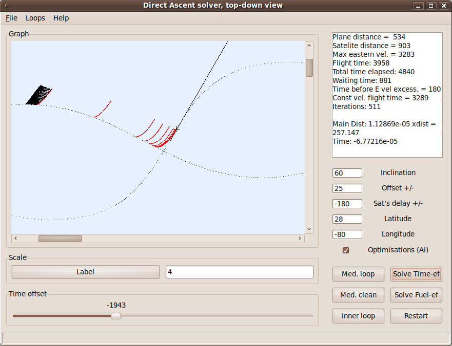 Direct ascent calculatorThis application serves as a visualisation of my direct ascent algorithm, used in Launch MFD. The ship's trajectory, being the calculations' result, is displayed in the graphical part of the program, while the flight's parameters in means of time are displayed in the right part of the program. The algorithm uses fuzzy logic (libFuzzyEngine++) to increase speed of numerical solving and, as such, is the subject of my Master Thesis. A detailed description is available in Launch MFD's documentation. |